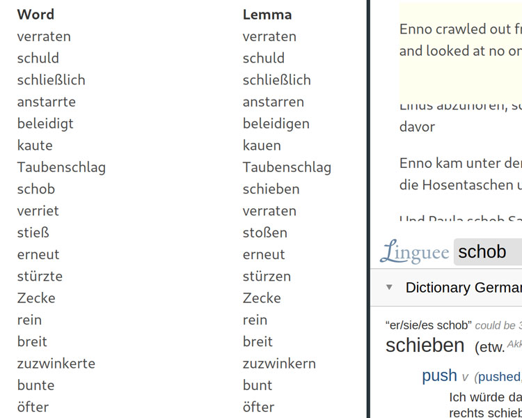 Another script I wrote around this time was a parallel text reader. This script would use Google Translate to translate each sentence of a text and output an html file with the text in both languages (the translated sentence could be revealed on clicking). Soon, I added an iframe to the side to display definitions on word highlight events.