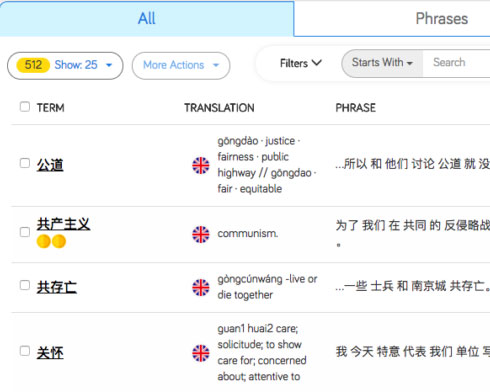 Lomb's dual language subtitle player is ideal for working with videos. The interactions are also tracked and used for memory trace estimation. All new words are added to the revision list automatically.