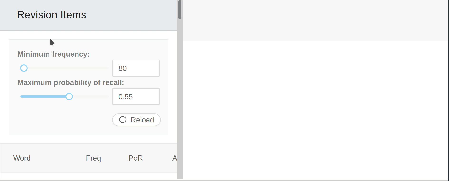 - Recall that at this point I was still having to work on a blacklist by hand. However the clicking and scrolling involved in reading and revising could be tracked and used to determine which words were already known, and which were unknown or likely to be forgotten soon.