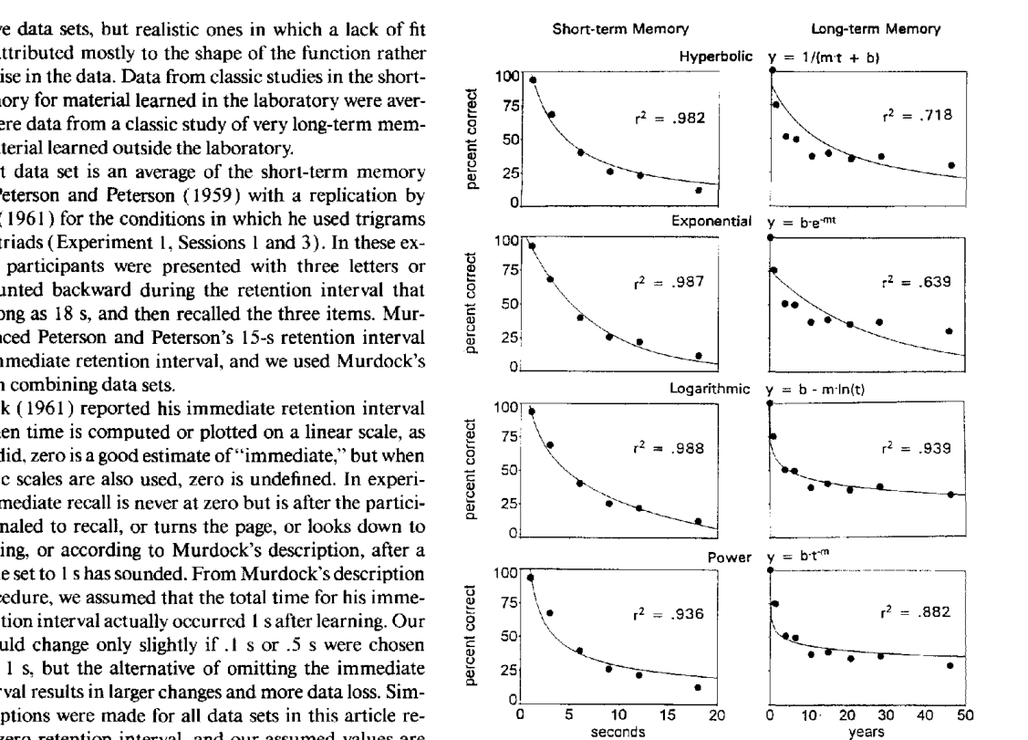 - 100 Years of Forgetting. An extensive survey of memory trace datasets dating back all the way to the 19th century. It shows that several two-degree-of-freedom functions can fit the dataset very well (around 90% explained accuracy). Power-law and logarithmic functional forms perform very well, whereas the exponential decay model used or implied by many popular SRS algorithms performs really badly.