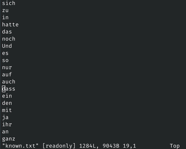 One of these scripts would generate the word frequency list from a text or collection of texts. All sentences in the text were lemmatized using Python’s NLP libraries, and then the frequency of each lemma was tallied. The script just dumped this list as a raw text file and I studied from there. Soon I extended the script to accept a blacklist of words to be filtered out. Since this blacklist was just the original list with the unknown words deleted, I originally studied in vim. I would go line by line deleting unknown words until I ran out of patience and deleted the rest of the document. Soon I had a reasonably large blacklist, but still the process was very inefficient.